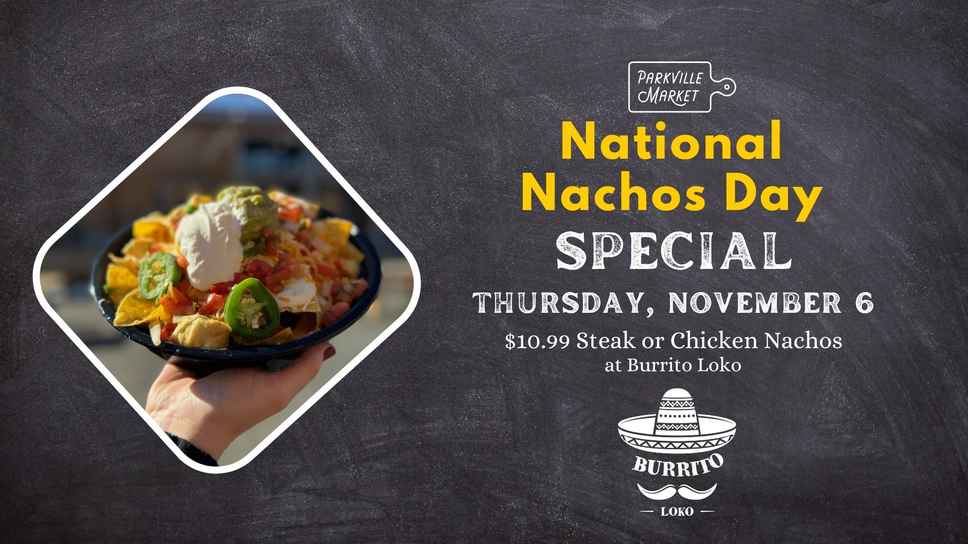 Join us on Thursday, November 6, at Burrito Loko! In honor of National Nachos Day, they’re serving up delicious, steak or chicken nachos for $10.99!