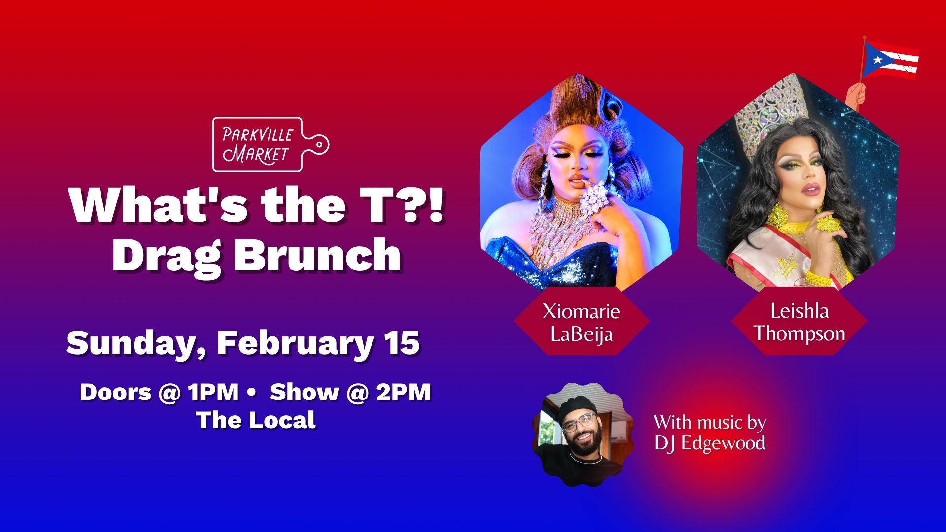 Don't miss the next What's the T?! Drag Brunch at Parkville Market on Sunday, February 15! Doors open at 1PM and the show starts at 2PM. Our fabulous host Xiomarie LaBeija will be joined by special guest Leishla Thompson and as always, DJ Edgewood will be here to help turn The Local up! Tickets are $35 and include […] |
